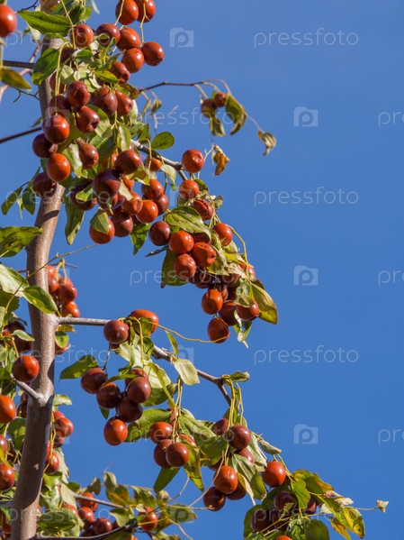Спелые сочные коричневые ягоды унаби (зизифус, китайский финик) на ветвях деревьев на фоне голубого неба