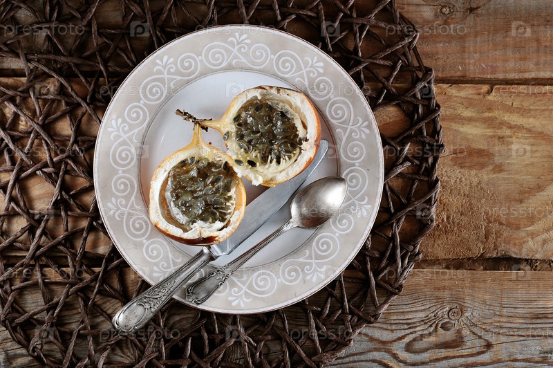 Маракуйя гранадилья или гренадия на деревянном деревенском фоне