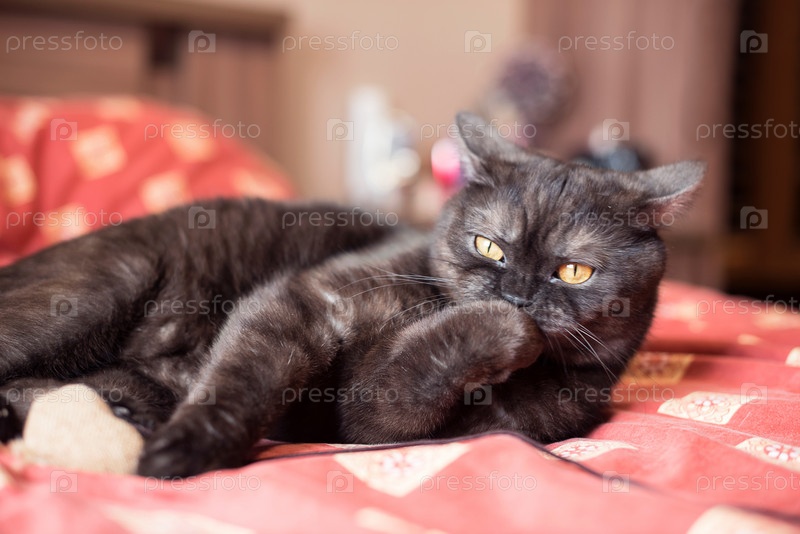 Кот лежит и лижет лапу