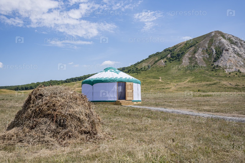В чистом поле на фоне голубого облачного летнего неба стоит дом кочевника – белая башкирская юрта. К ней ведет гравийная дорожка. Дверь юрты открытая. Перед ней лежит небольшой стог сена. На заднем плане реликтовая гора шихан Тора-Тау
