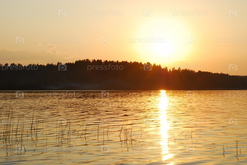 Оранжевый закат на берегу лесного озера