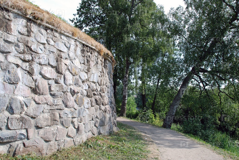 Полукруглая часть каменной стены. Часть старой каменной стены крепости из крупных камней разной формы и цвета. Между раствором. Справа дорога вдоль стены