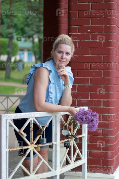 Поясной портрет женщины с букетом полевых цветов. В парке в кирпичной беседке. Смотрит в камеру