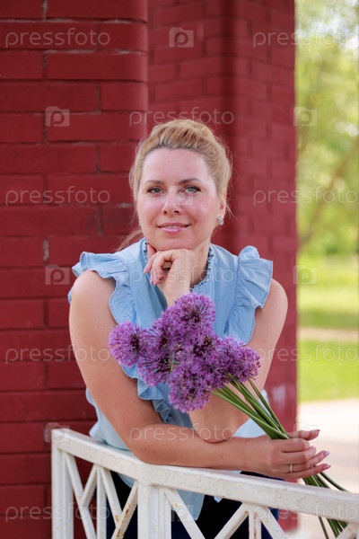 Поясной портрет женщины с букетом полевых цветов. В парке в кирпичной беседке. Смотрит в камеру