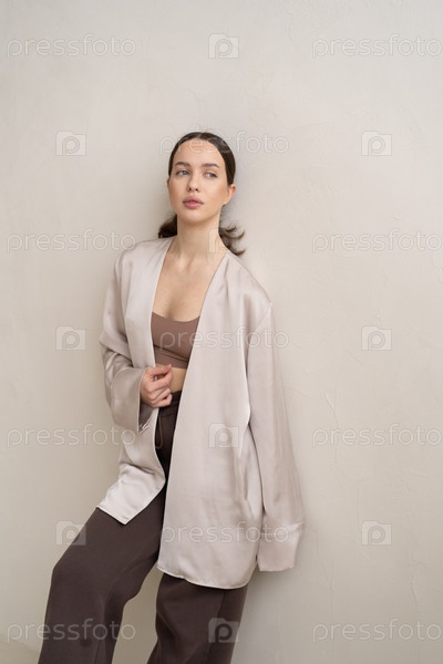 Молодая красивая женщина позирует в студии в бежевом плаще