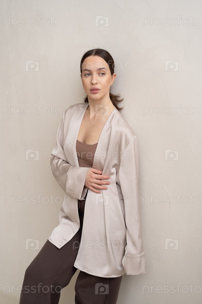 Молодая красивая женщина позирует в студии в бежевом плаще