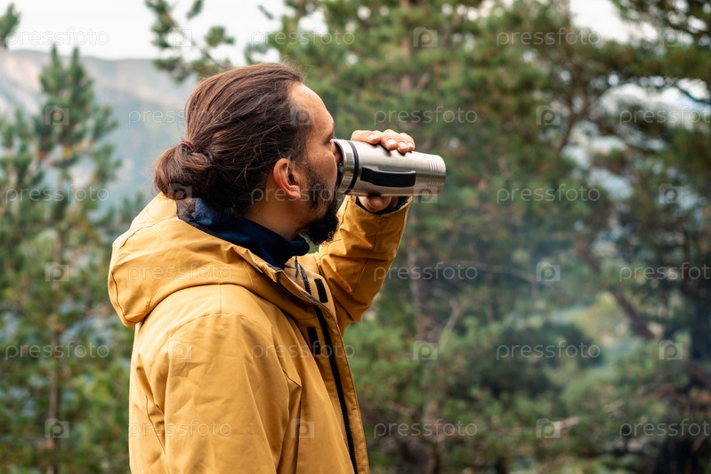Мужчина в оранжевой куртке пьет чай из металлической кружки. На заднем плане размыты хвойные деревья и горы. Краснодар, Россия 19 сентября 2022 г
