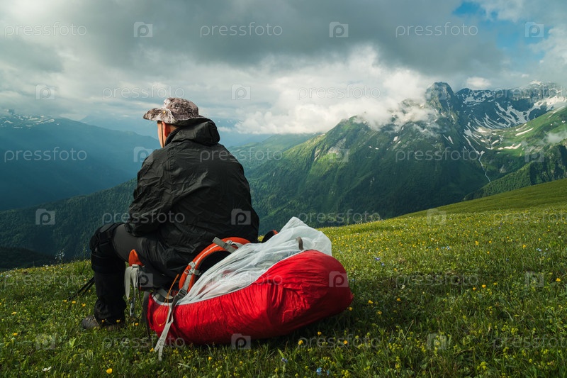 Турист в черной одежде отдыхает на перевале с прекрасным видом на горы. Мужчина сидит на рюкзаке и смотрит на заснеженные вершины гор. Поход в горы летом