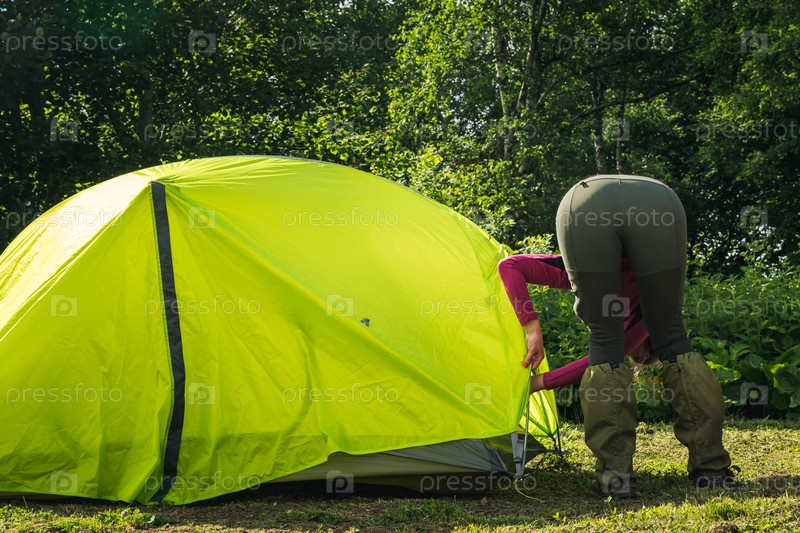 Кавказская туристка в брюках и фиолетовой куртке ставит палатку. Наклоняюсь, чтобы поправить светло-зеленый тент. Вид сзади. Горный поход