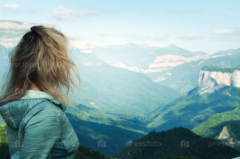 Девушка в синей толстовке и с белыми волосами на фоне гор. Боковой вид сзади. Кавказская женщина смотрит на горную панораму. Красивое ущелье скал и леса