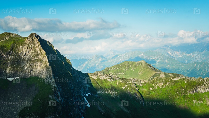 Скалы, перевалы и горные вершины на фоне голубого неба с облаками. Горный летний пейзаж. Высокие горы с зеленой травой и снегом