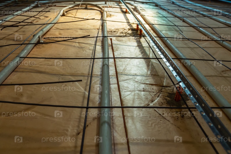 Развернуты трубы для теплого пола на обогревателях. Монтаж теплого пола в частном доме. Поверх труб лежат направляющие и армирующий пояс для заливки бетонного пола