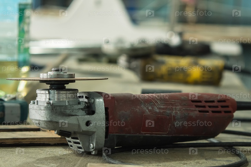 Крупный план красной грязной угловой шлифовальной машины. Инструмент без защитного кожуха лежит на столе в магазине. Специальный электрический инструмент в цехе