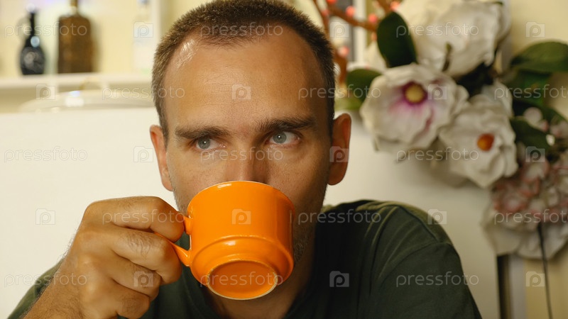 В кофейне мужчина средних лет наслаждается чашкой горячего кофе. Мужчина пьет кофе из оранжевой кружки