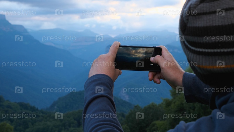 Мужчина с мобильным телефоном в руках фотографирует закат в горах. Путешественник фотографирует красивый горный закат на свой смартфон