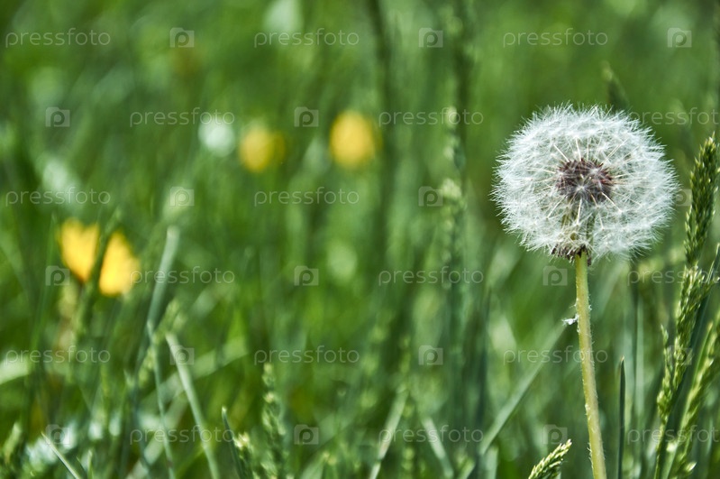 Одуванчик на фоне зеленой газонной травы