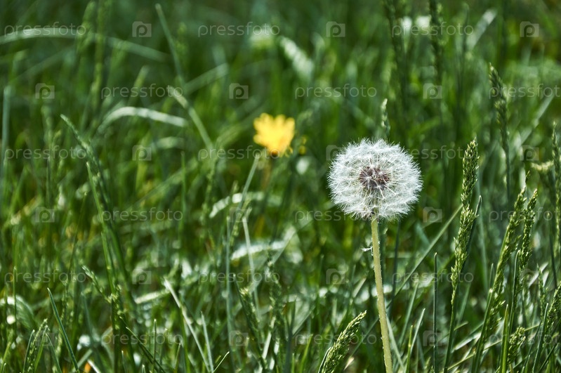 Одуванчик на фоне зеленой газонной травы