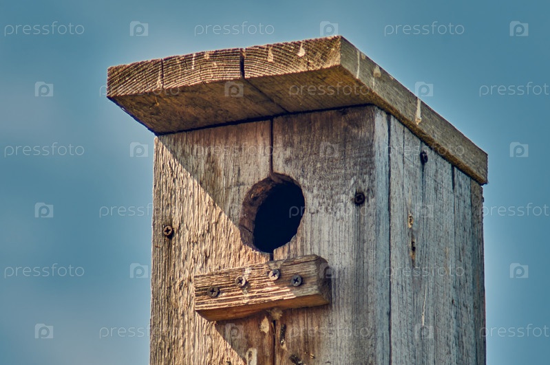 Старый деревянный скворечник с отверстием и посадочной планкой на фоне неба