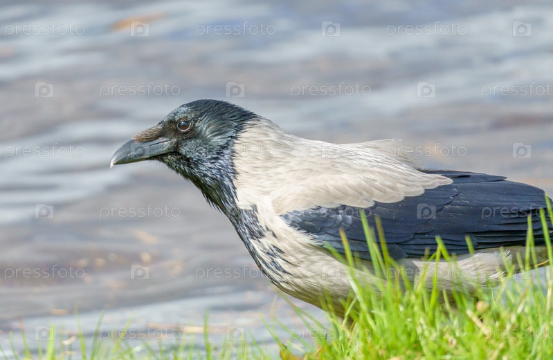 Серый ворон Corvus corone cornix стоит в траве у воды