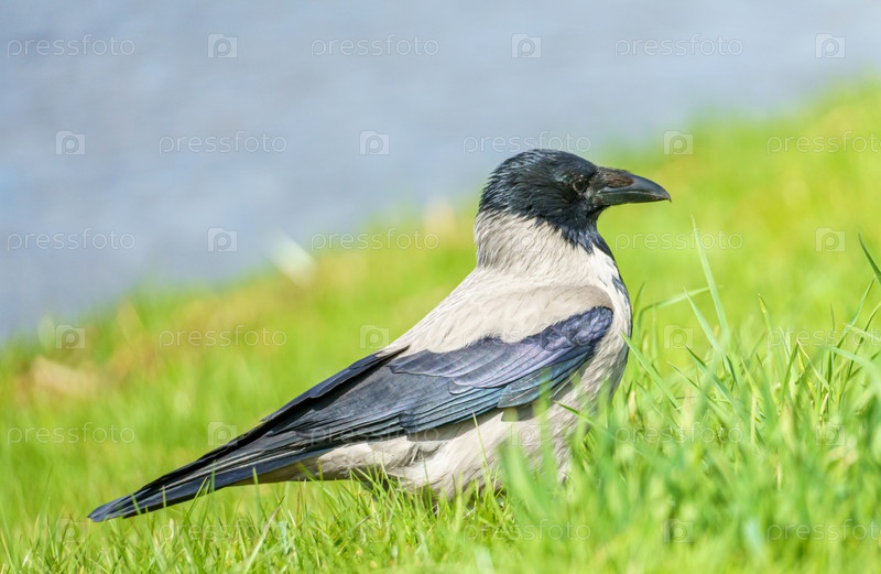 Серый ворон Corvus corone cornix стоит в траве у воды