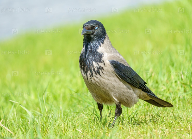 Серый ворон, Corvus corone cornix, стоит в траве у воды