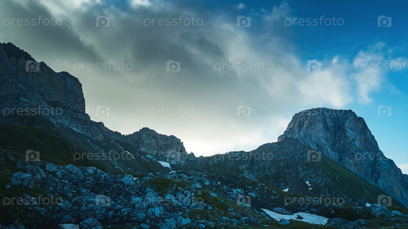 Высокие скалы на фоне неба с черными тучами. Летний горный пейзаж