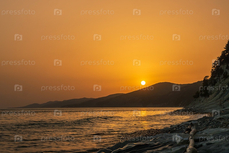 Спокойное море во время красивого желтого заката. Силуэты черных горных холмов на фоне воды. Солнце прячется за горой. Морской пейзаж