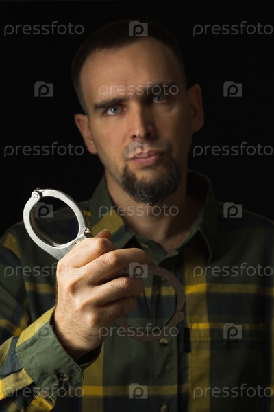 Портрет бородатого мужчины с наручниками в одной руке. Белый мужчина в зеленой клетчатой рубашке на черном фоне. Строгий взгляд. Понятие преступления и наказания
