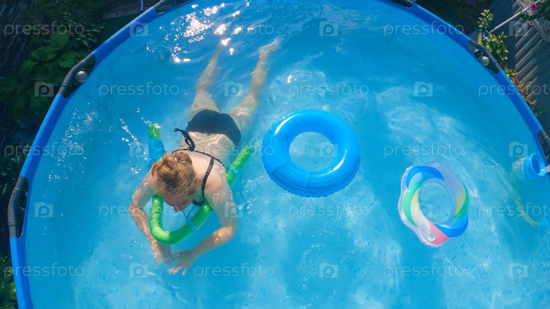 женщина в черном купальном костюме плывет на лапше в бассейне, между надувными коленями детей. Вид сверху. Отдых в бассейне на заднем дворе в летний день