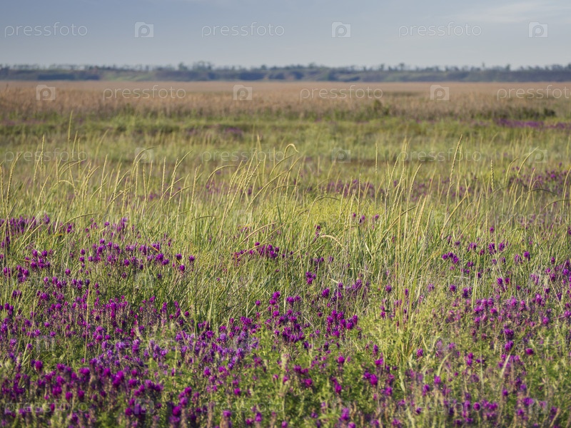 Цветущая степь и луга в Приморской пойме. Красивый весенний пейзаж. Ярко-фиолетовые полевые цветы