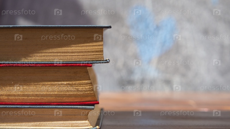 Баннер: стопка книг на темно-сером фоне доски с нарисованными сердечками и местом для копирования. Концепция образования - это книги на столе в классе