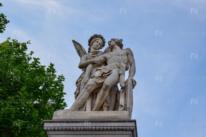 Скульптура ангела с венком на голове, держащего мужчину