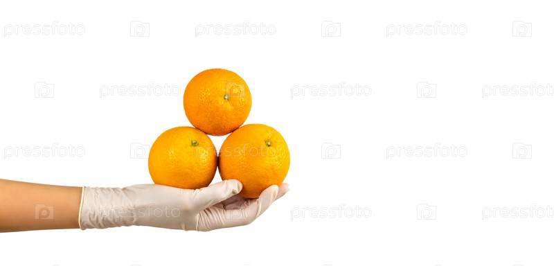 Рука продавца в перчатке с тремя апельсинами. Концепция доставки продуктов на порог, безопасные покупки. Изолированные на белом фоне. Баннер, место для текста