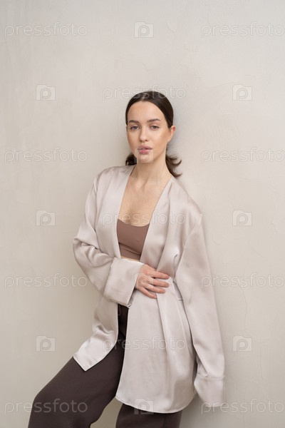 Молодая красивая женщина позирует в студии, стоя в бежевом плаще и коричневых штанах