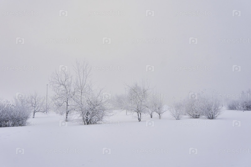 Морозное туманное утро в парке около реки Енисей в центре Кпаснеоярск