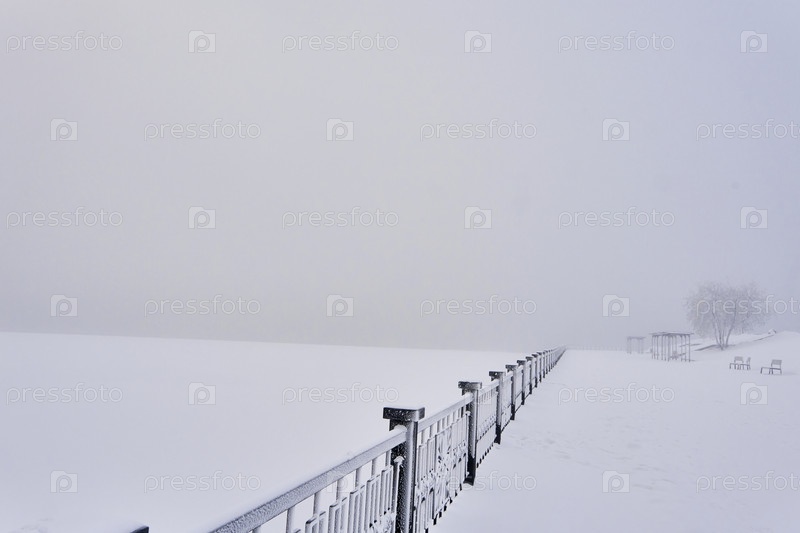 Морозное туманное утро в парке около реки Енисей в центре Кпаснеоярск