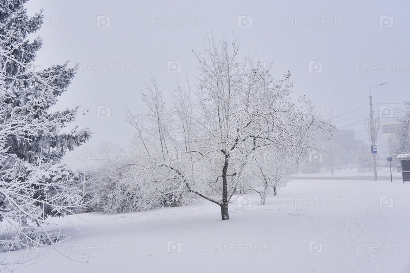 Морозное туманное утро в парке около реки Енисей в центре Кпаснеоярск