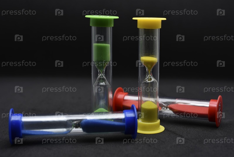 Песочные часы из разноцветного стекла на черном фоне. Старинные песочные часы