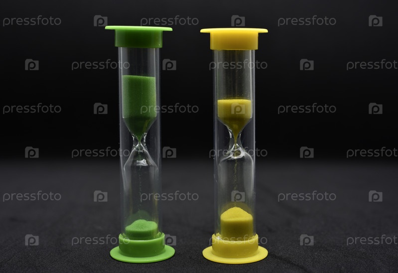 Песочные часы из разноцветного стекла на черном фоне. Старинные песочные часы