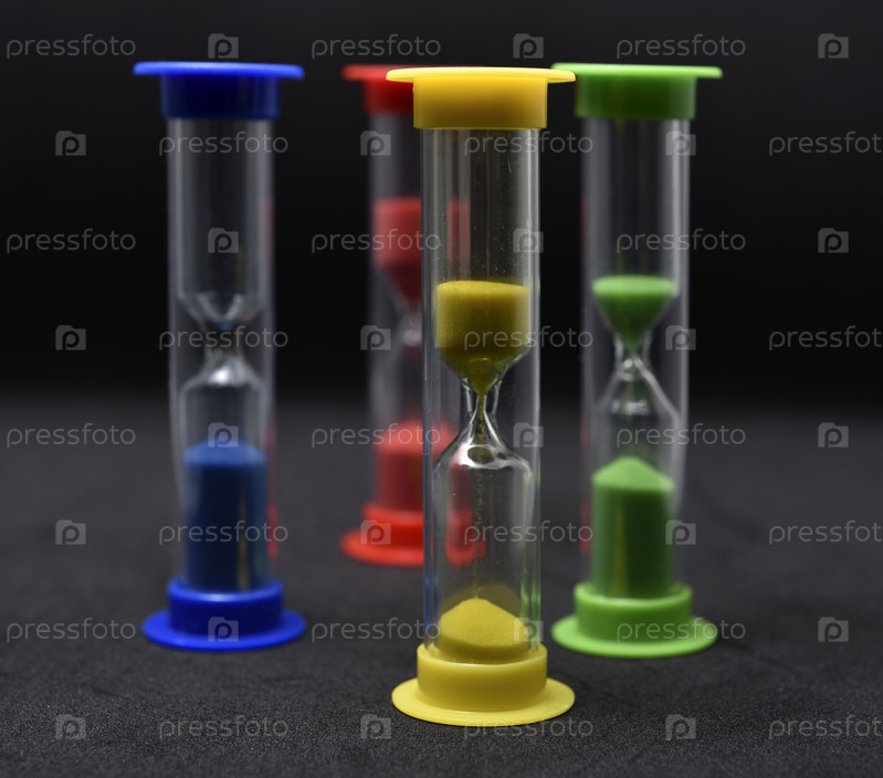 Песочные часы из разноцветного стекла на черном фоне. Старинные песочные часы
