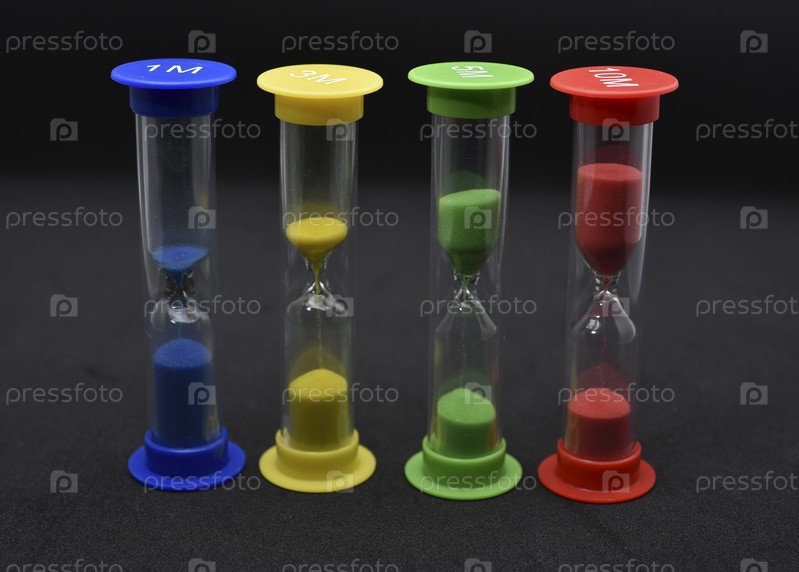 Песочные часы из разноцветного стекла на черном фоне. Старинные песочные часы