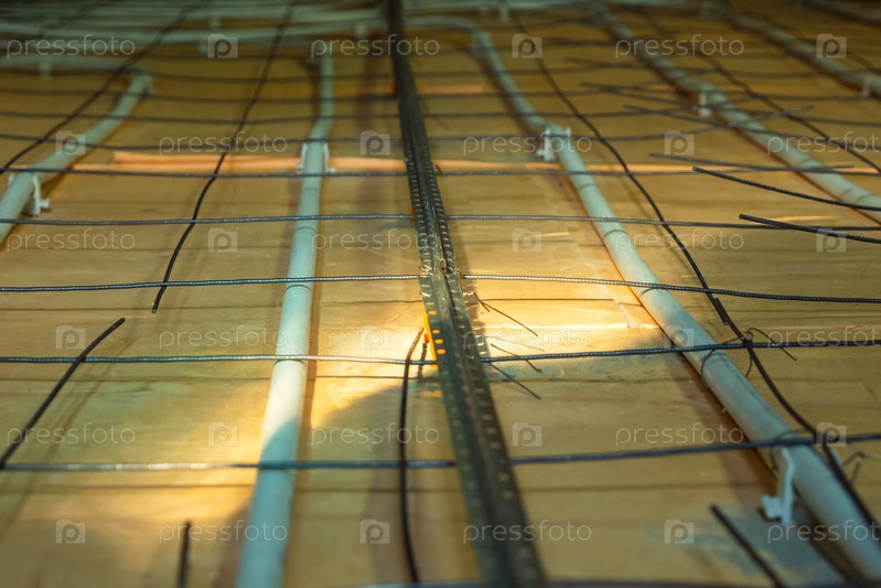 Теплый пол в частном доме. В крупном плане. Монтаж теплого пола. Подготовка к заливке бетонного пола. Выборочный фокус