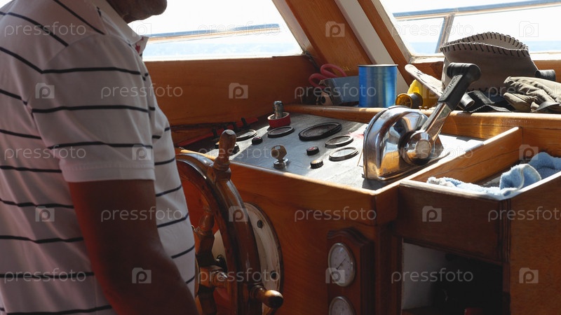 Капитан крутит деревянное колесо на корабле. Лодка плывет по морю. Руль лодки на лодке для морских путешествий и приключений. Летний отдых на Средиземноморье. Лодка качается на волнах