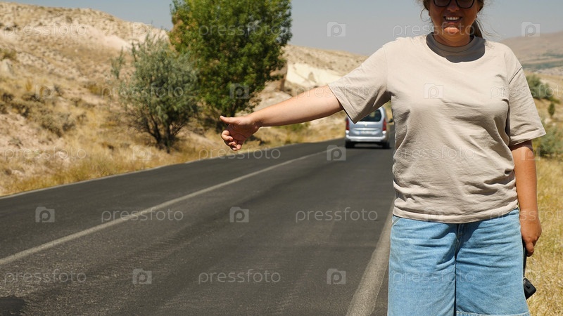 Молодая женщина путешествует автостопом. Девушка в футболке, шортах и очках едет автостопом по проселочной дороге. Автостоп в одиночку, путешествие налегке. Лето, проселочная дорога