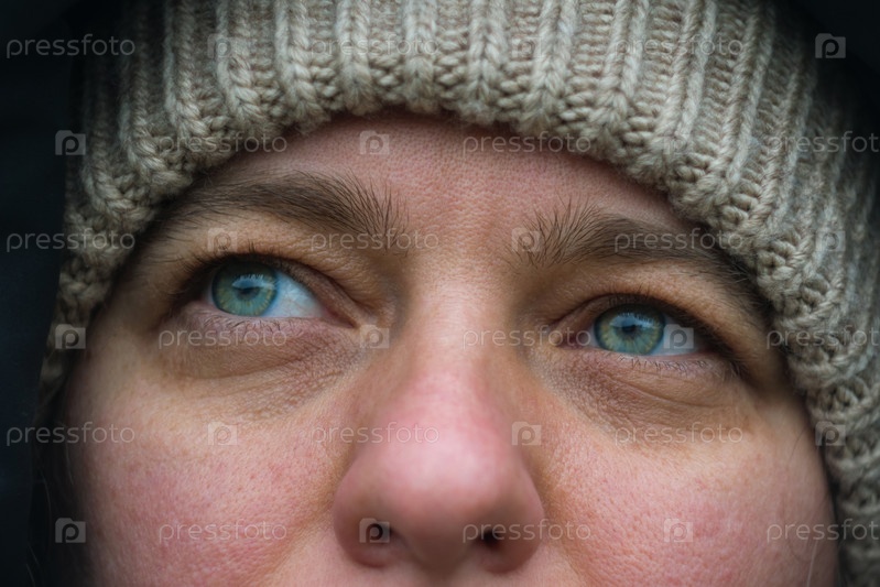 Крупный план лица кавказской девушки с красивыми зелено-голубыми глазами. Женщина на улице в вязаной шапке. Взгляд женщины мечтательно обращен в сторону