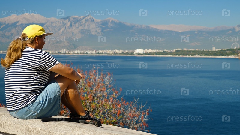 Девушка сидит на балюстраде на краю обрыва перед горами, глядя на море. Одинокая девушка в отпуске, наслаждаясь видом на Средиземное море