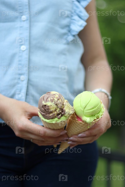 Женщина держит рожок мороженого в обеих руках. Снято крупным планом
