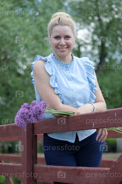 Поясной портрет женщины с букетом полевых цветов. Смотрит в камеру