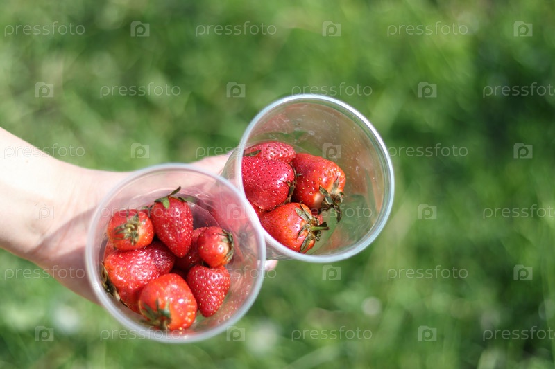 Женщина держит на вытянутой руке два пластиковых стакана с клубникой. На фоне зеленой растительности. Крупный план