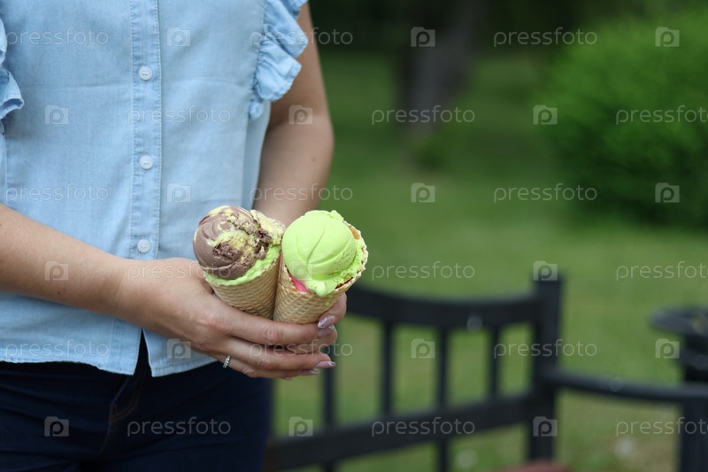 Женщина держит рожок мороженого в обеих руках. Снято крупным планом